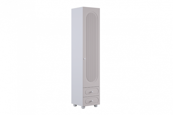 Модуль оснащён одной распашной дверцей и двумя вместительными выкатными ящиками в нижней части, предназначенными для хранения одежды, текстиля или аксессуаров. Внутреннее наполнение можно выбрать в зависимости от потребностей: шкаф может быть укомплектован полками или штангой для плечиков, что делает его удобным для хранения как сложенных вещей, так и одежды на вешалках.
