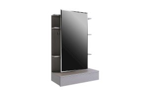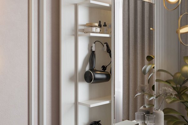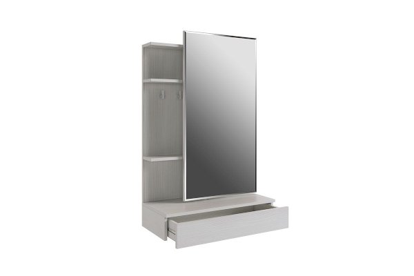 Зеркальная панель трюмо работает по принципу шкафа-купе, что обеспечит вам легкий доступ к вещам, которые лежат на полках за зеркалом.