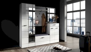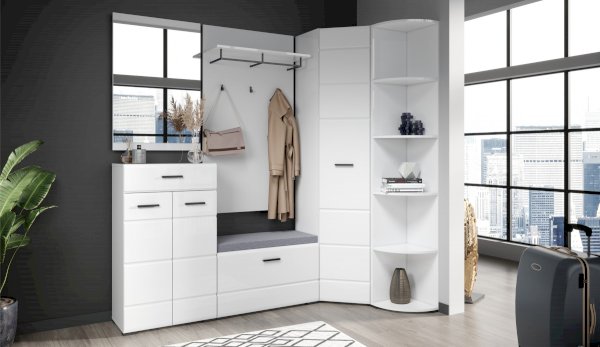 Компактная и функциональная вешалка из белого ЛДСП включает в себя самое необходимое для организации хранения в прихожей. Верхняя полка разместит головные уборы, а металлическая штанга и пять крепких крючков контрастного черного цвета поместят на себе одежду объемом с небольшой шкаф. Идеально компонуется со всеми модулями системы Йорк.