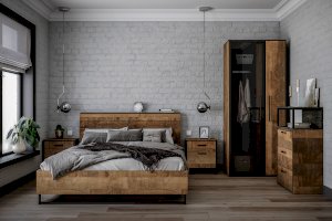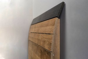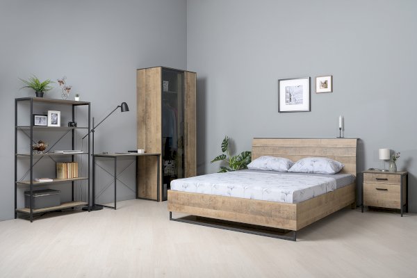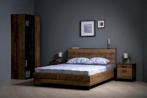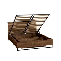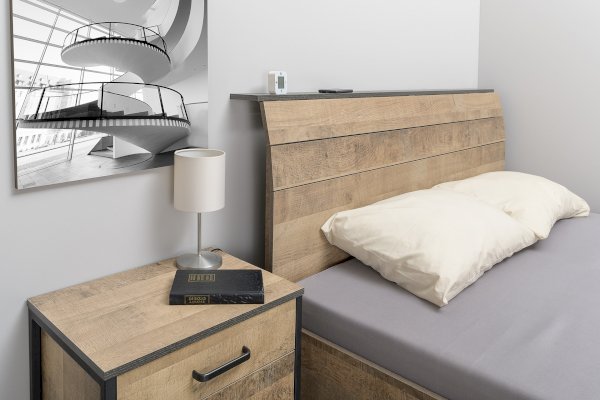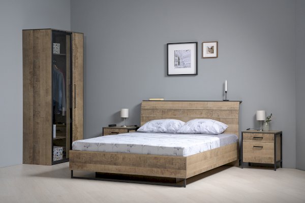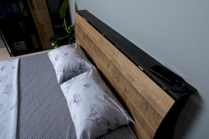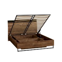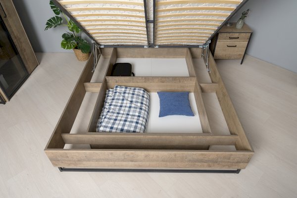 Планкованное изголовье с изгибом — два варианта конфигурации: с полкой и без неё. Кровать может быть оснащена ортопедическим основанием с подъёмным механизмом, который открывает доступ к вместительному коробу для хранения.