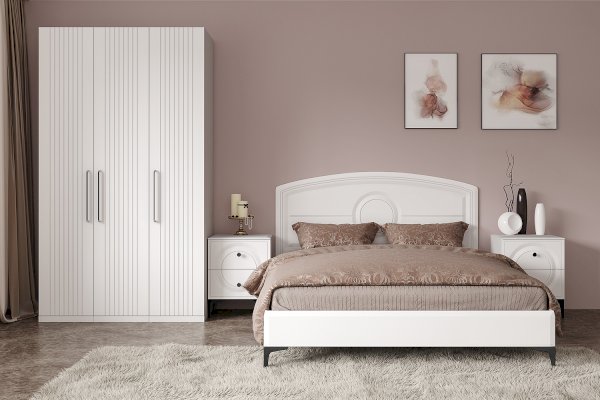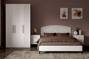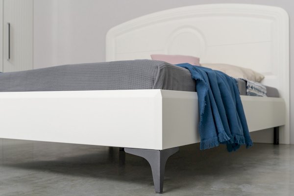 Кровать установлена на высокие ножки, что делает конструкцию лёгкой и воздушной, изголовье кровати декорировано фрезеровкой. Матрас укладывается на ортопедическое основание с гнутоклееными ламелями.