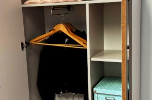 Шкаф "Доминика" оснащен глухими фасадами, скрывающими за собой просторное внутреннее пространство. На одной стороне шкафа находится штанга для одежды, обеспечивая удобное место для хранения одежды на вешалках.